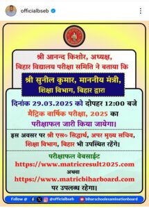 बिहार बोर्ड 10वीं मैट्रिक परीक्षा आज दोपहर 12:00 बजे घोषित किया जाएगा बता दे कि बिहार विद्यालय प्रचार समिति बिहार बोर्ड के अध्यक्ष आनंद किशोर ने बताया कि बीएसईबी बिहार बोर्ड कक्षा दसवीं परीक्षा के परिणाम की घोषणा शिक्षा मंत्री सुनील कुमार के द्वारा 29 मार्च 2025 को दोपहर 12:00 बजे की जाएगी। बिहार बोर्ड मैट्रिक परीक्षा 2025 परीक्षा पर घोषणा के समय शिक्षा विभाग। बिहार के प्रमुख सचिव एवं सिद्धार्थ उपस्थित रहेंगे फुल स्टार बिहार विद्यालय समिति के मुख्य भवन के सभागार में बिहार बोर्ड 10वीं का रिजल्ट जारी किया जाएगा। बिहार बोर्ड मैट्रिक वार्षिक परीक्षा 2025 के सभी छात्र का इंतजार कुछ पल के बाद समाप्त होने वाला।